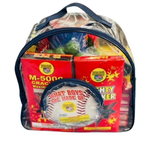 Convenient, affordable, reusable, age appropriate. Smoke balls, snappers, confetti, M-5000 firecrackers, fountains and more. And he’ll have a handy backpack left when the party’s done. Your one-stop grab-bag for that little guy in your life.
